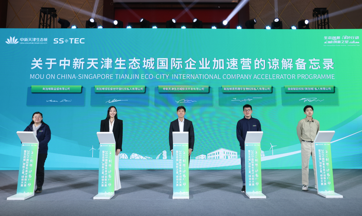 颁奖典礼上,作为大赛的主办方之一,生态城合资公司正式发布了“中新天津生态城国际市场准入方案(IMAP)”,依托自身特有的中新两国资源,将积极协助国内企业对接新加坡的政府部门、高校科研机构、金融及投资机构、商协会以及企业咨询服务机构等市场资源,助力国内企业出海。该方案也将为参赛的国内项目加速实现国际化发展提供重要支撑。生态城合资公司还与四家获奖的新加坡企业——新加坡绿炭盛世环保科技私人有限公司、新加坡馥益盛有限公司、新加坡青熙晟华生物科技私人有限公司和旋启智能科技(新加坡)私人有限公司,分别签署了《中新天津生态城国际企业加速营(ICAP)谅解备忘录》,将协助这些企业快捷进入生态城、天津及中国北方市场。为帮助参赛团队更全面地了解生态城作为国家绿色发展示范区的独特优势,大赛组委会还在赛前组织大家走访了生态城多个点位,了解生态城的开发建设成果和特色产业园区。