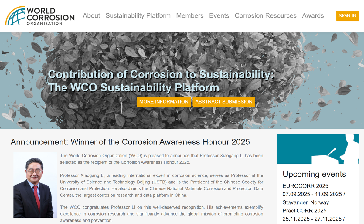 近日,中国腐蚀与防护学会理事长、北京科技大学教授李晓刚荣获联合国世界腐蚀组织(WCO)颁发的2025年“腐蚀成就奖”。