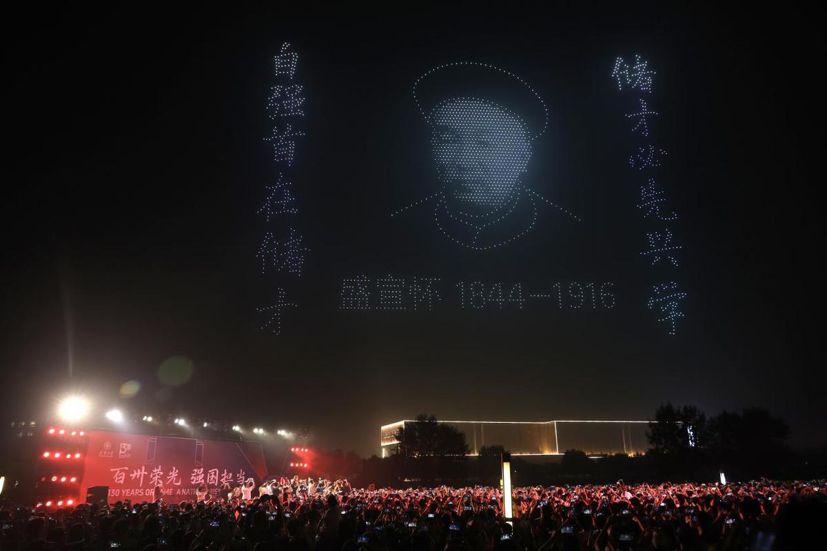 在众人的翘首企盼中,无人机展演于晚上9时正式开始。无人机升空后,首先在夜空中亮起的是天津大学创始人——盛宣怀的形象,现场惊叹连连。1895年,盛宣怀首倡“自强首在储才,储才必先兴学”,创办北洋大学,“兴学强国”也因此成为中国现代大学的精神元始。随后,“百卅荣光,强国担当”的口号被点亮,伴着“实事求是”的校训,双校区的北洋纪念亭依次矗立于夜幕中。130周年校庆标识凌空而出,“百卅荣光,在此刻具象化了!”