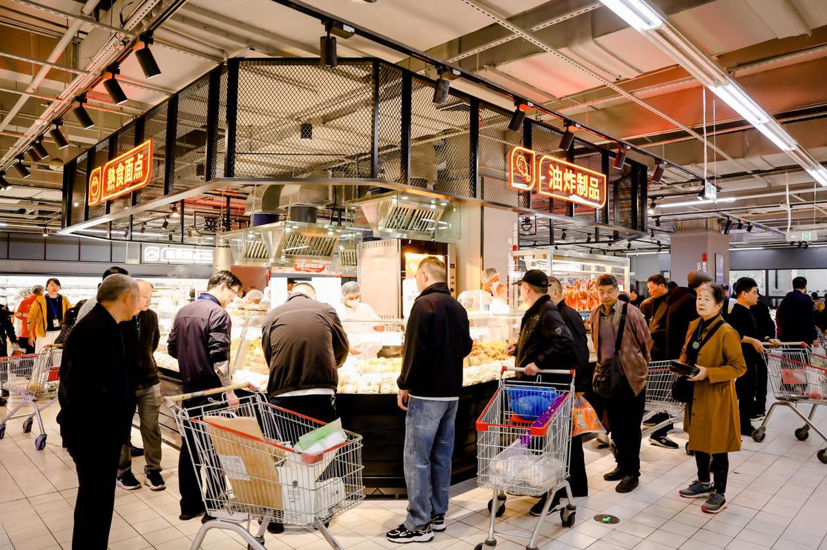 生鲜区是家庭采购的核心区域,临平1号店在此轮调改升级中重点丰富了秋冬应季食材,现场可以看到蜜桔、红柚、芋艿、白菜、山药等时令蔬果堆头饱满,各色菌菇拼盘、小份净菜与火锅涮品食材摆满货台,罗氏虾、大闸蟹、进口三文鱼等鲜活水产均现挑现杀,呼应近期“一夜入冬”后市民对秋冬滋补与居家暖餐持续攀升的需求。