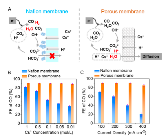 图1 (A)离子交换膜(左)与多孔膜(右)在电场中的传输特性。(B)不同离子浓度下CO法拉第效率对比测试。(C)不同电流密度下CO法拉第效率对比测试。
