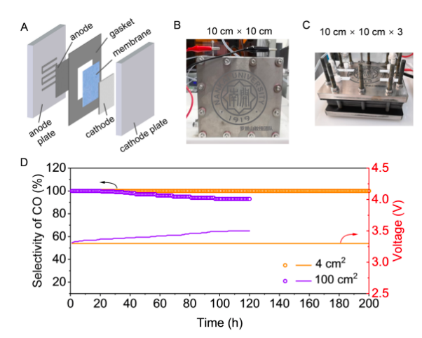 图2 (A)膜电极电解槽构件。(B)100 cm2电解槽图示。(C)300 cm2电堆(3层)图示。(D)长时间稳定性测试。