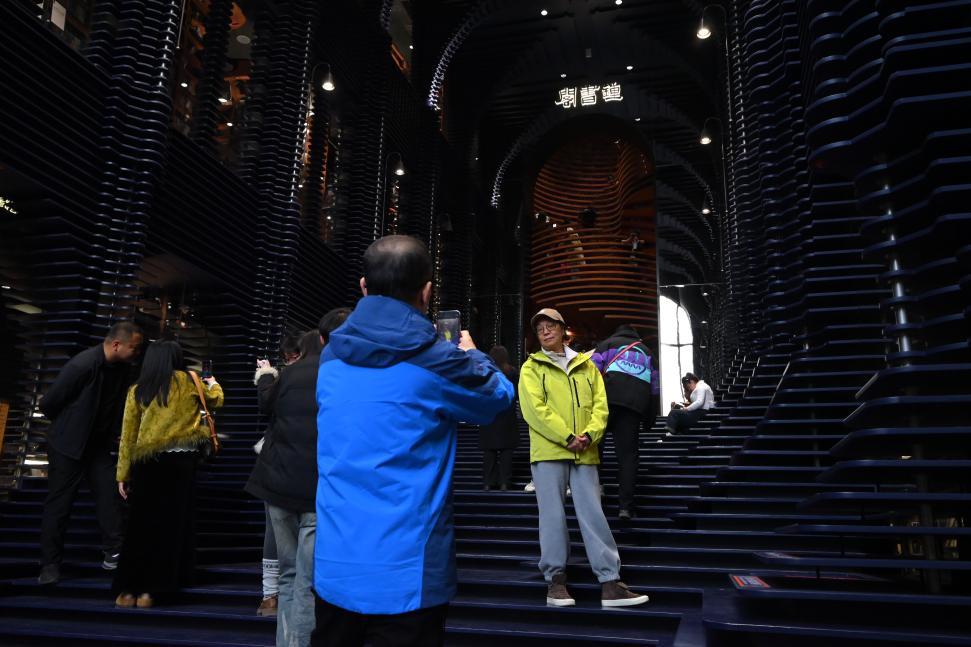 图说:多名游客在中庭区域打卡拍照(张颢玉摄)