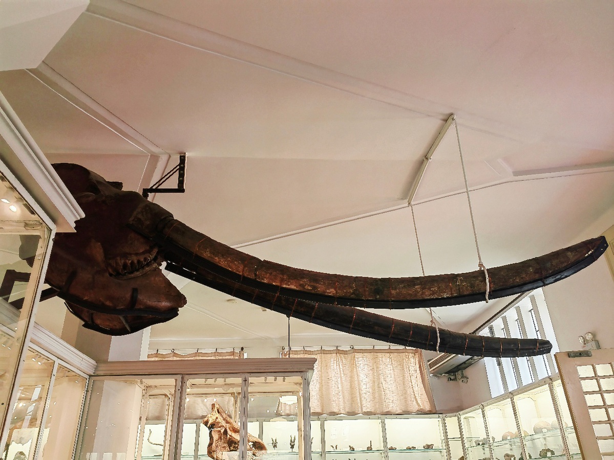 走进博物馆展厅,举目可见一具巨大的剑齿象头骨及下颌化石被悬挂在天花板上,给人以极大的震撼。这具剑齿象的骨骼化石,是全世界已经发现的剑齿象骨骼中最完整的一具,也是中国古生物发掘的重要成果之一。