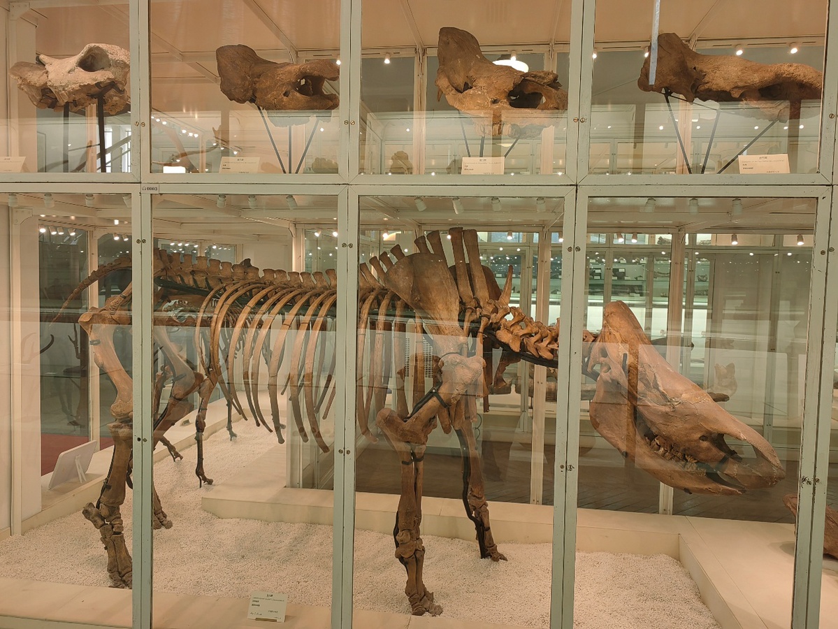 古生物展厅里,一副完整的披毛犀化石昂首而立,这件镇馆之宝是桑志华1922年在内蒙古萨拉乌苏河发现的,而且是目前世界上仅存的两具之一(另一具在巴黎自然博物馆)。披毛犀是生活在更新世时期的犀牛,也是最晚灭绝的史前犀牛,距今只有一万年左右。